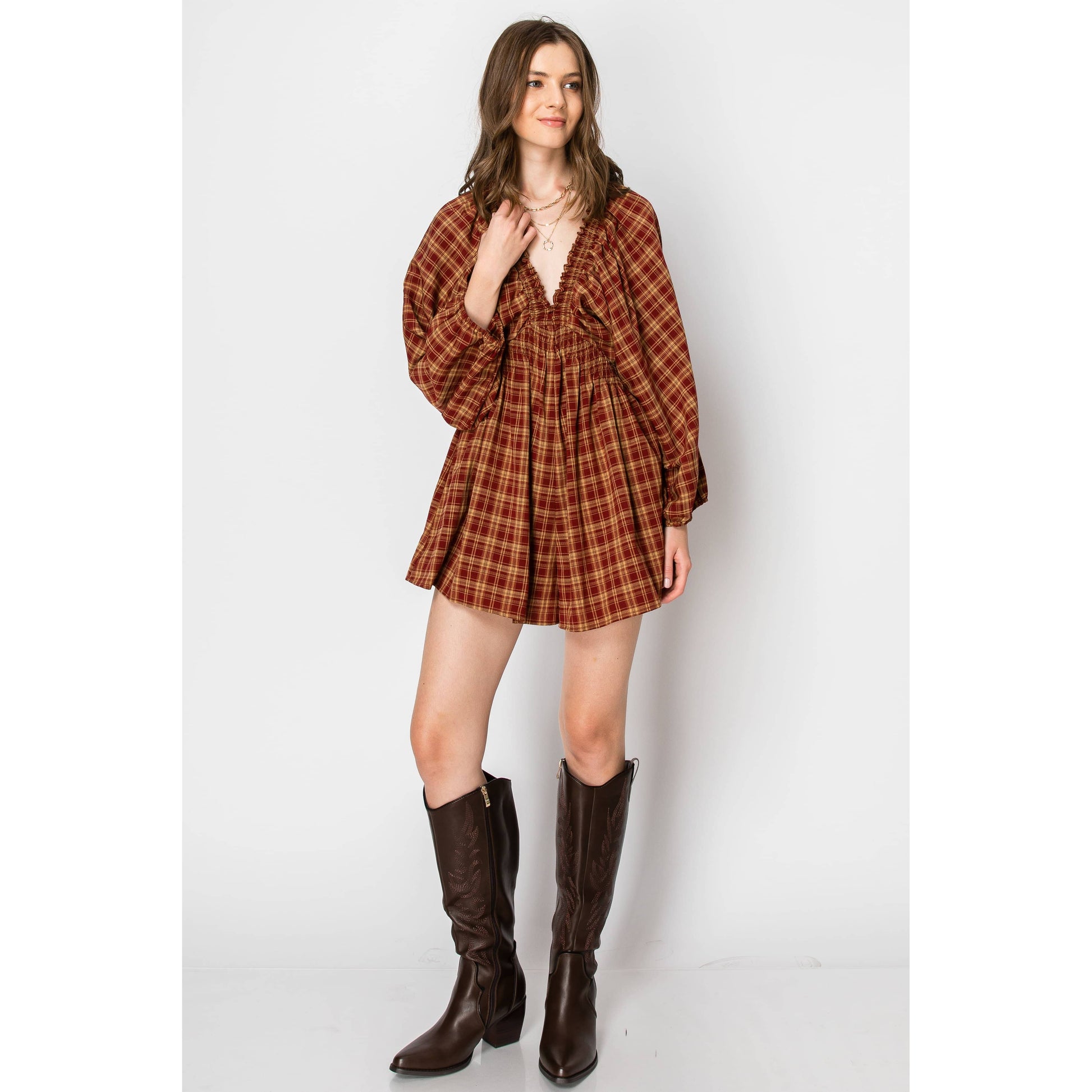 Dolman Sleeve Plaid Smocked V-neck ROMPER